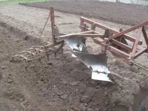 Данная конфигурация плуга, агрегатируемая с мини-трактором, считается наиболее простой в изготовлении. Вся работа по реконструкции конного плуга сводится к тому, чтобы приспособить к нему раму, имеющую специальный механизм крепления, оснастить его колесом (при необходимости) и утяжелителем.